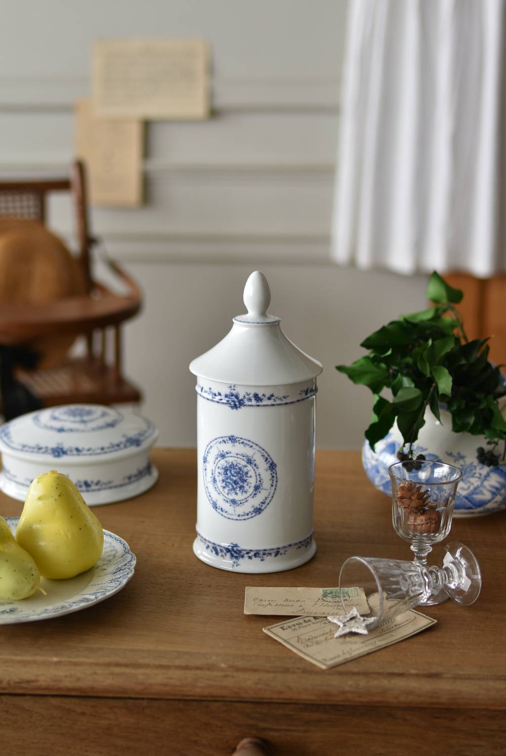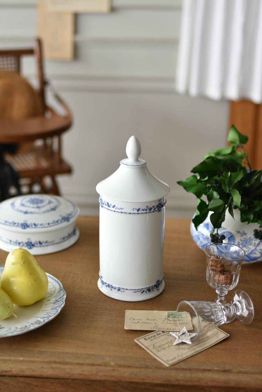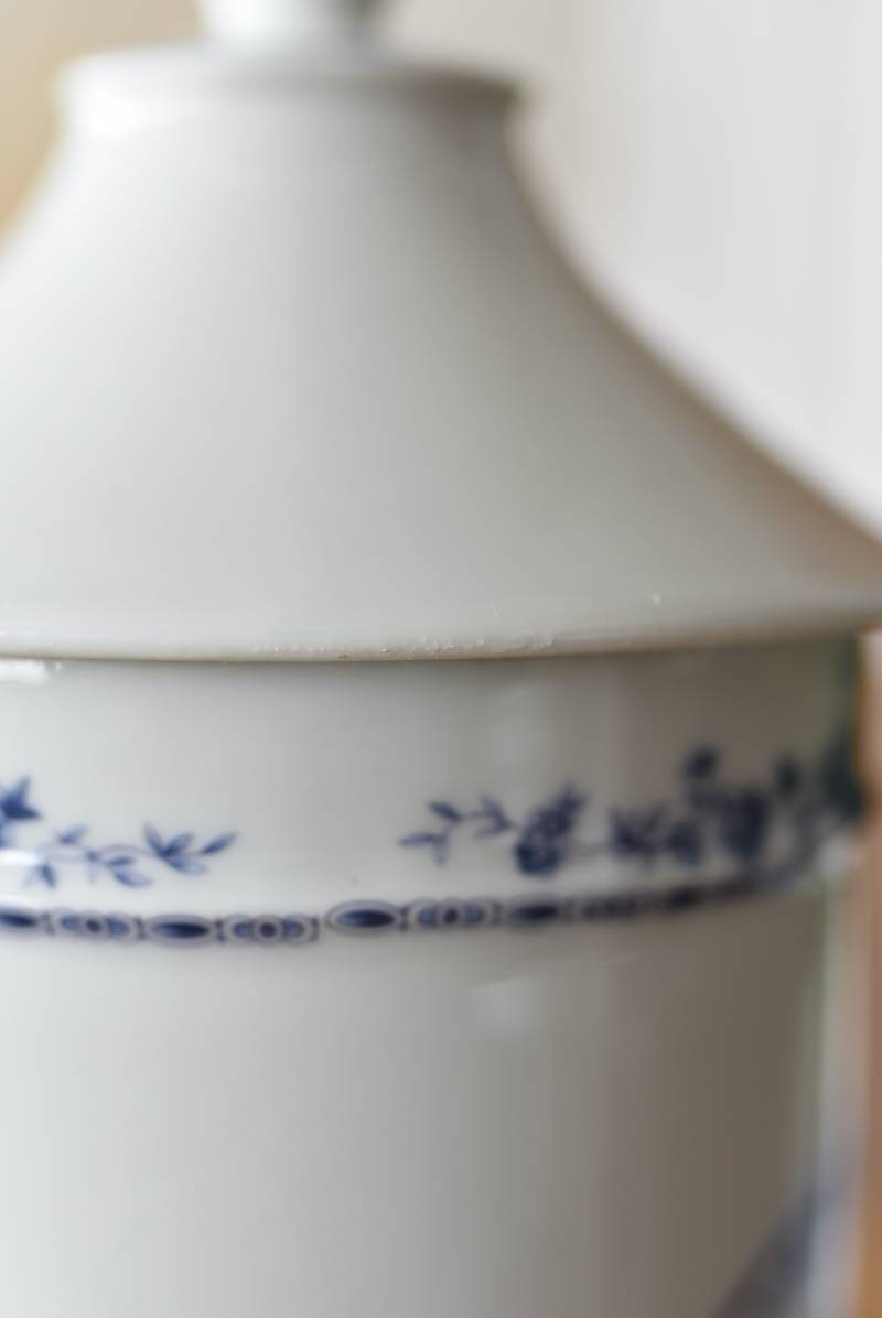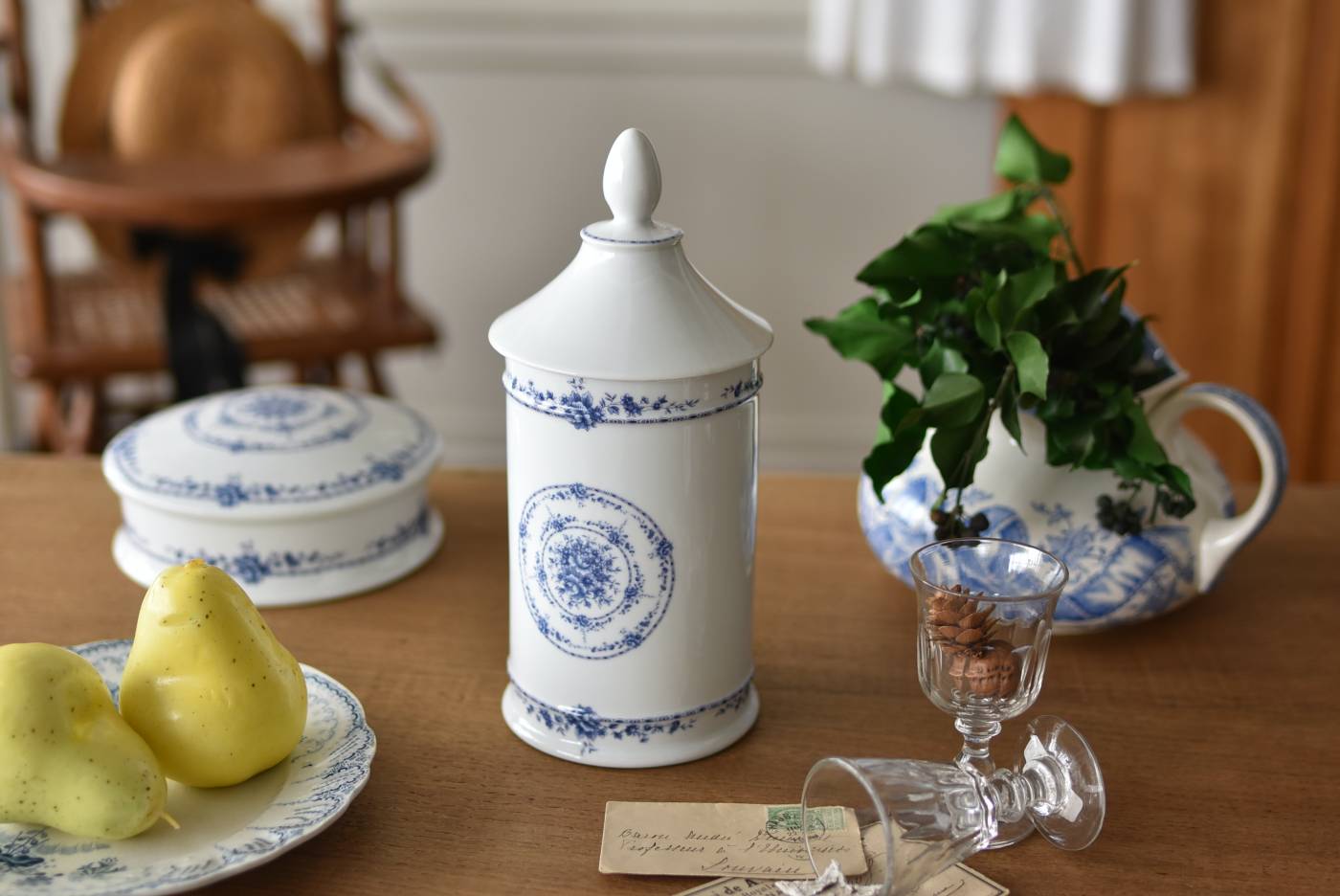 フランス・Limoges(リモージュ)のアンティークポット。 透き通るような白磁に澄んだブルーの模様が清楚で上品な印象の佇まい。艶やかな質感のボディはすらりとした高さのあるシルエットで、表面にあしらわれた繊細なお花の絵柄がエレガントな空間にも映える可憐なデザインとなっています。底裏には"Limoges"france"としっかりバックスタンプも押されている一品に。 大きすぎない程よいサイズ感で卓上ディスプレイとしても飾りやすく、スティックタイプのインセンスなどの長さのあるアイテムを収納するポットとしても活躍してくれるアイテムです。同じシリーズの小物入れと揃えてのご使用もおすすめです。 直径 約11.5cm H 約25cm 深さ 約16.5cm 口径 約9.5cm