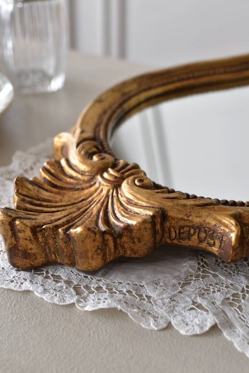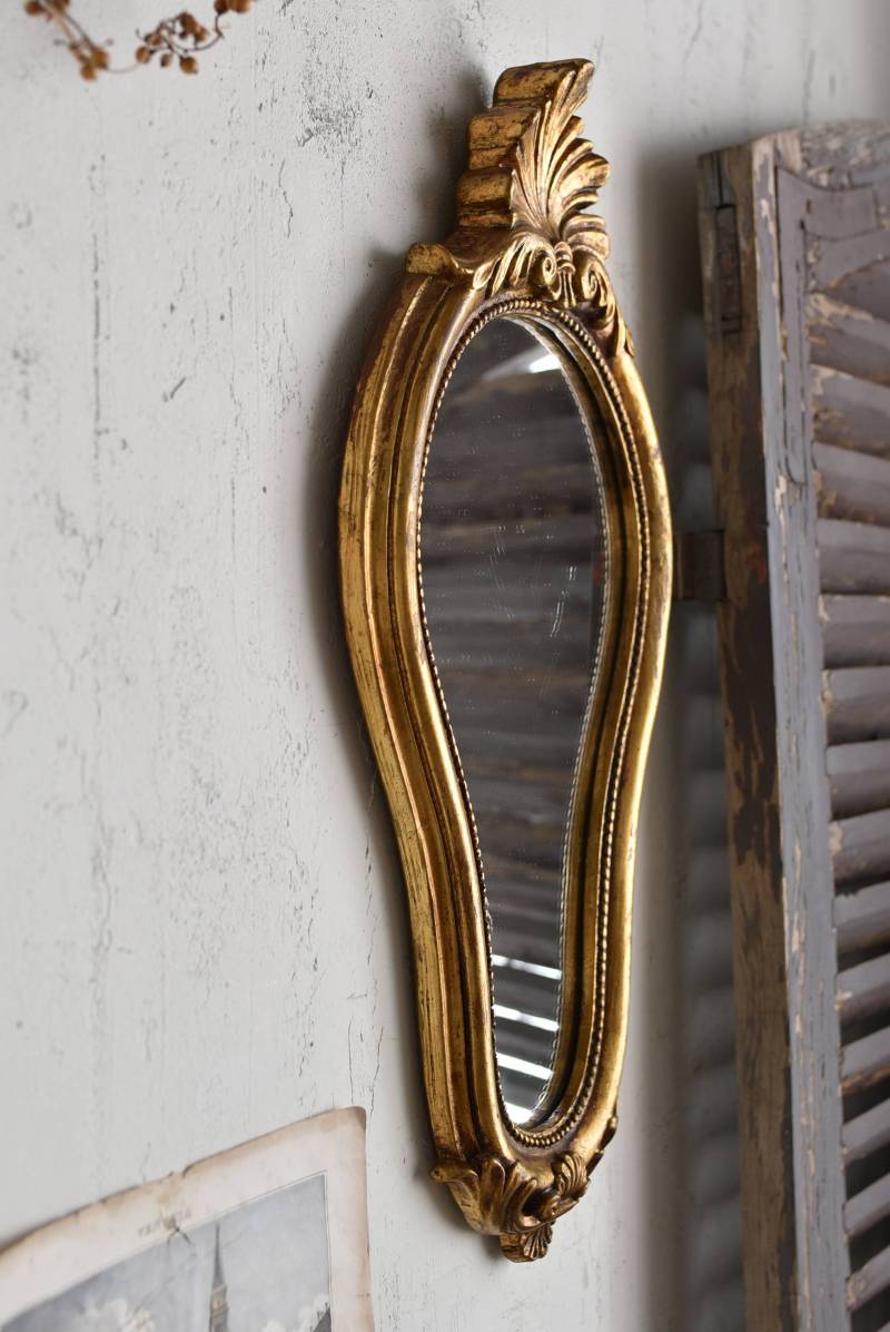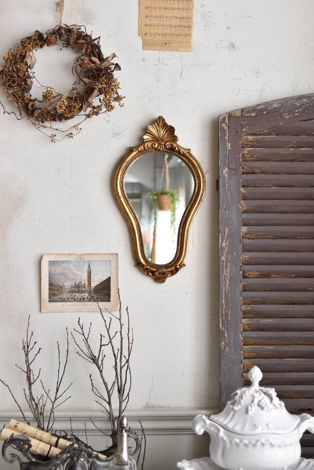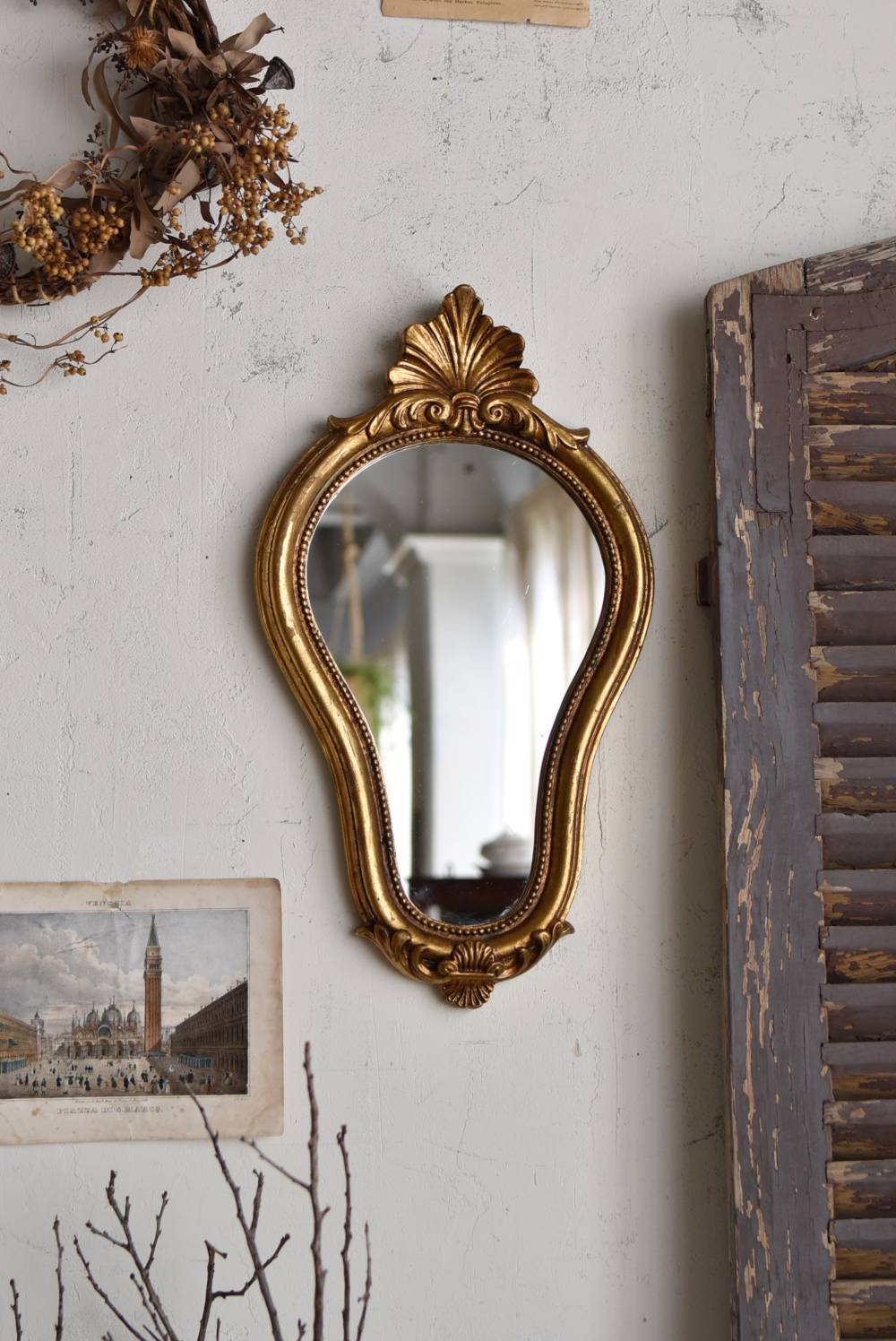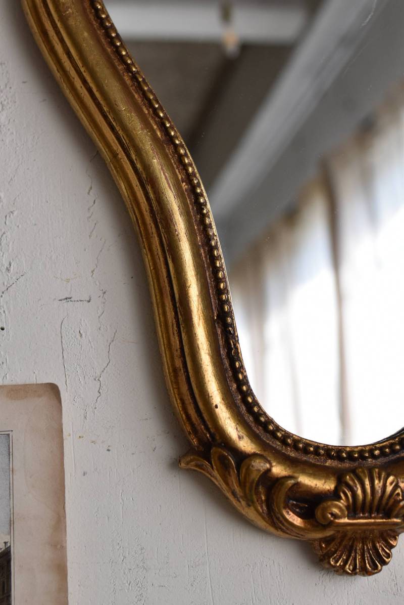 フランスのデコレーションミラー。 植物などの自然モチーフとなった立体感のある造形はしなやかに流れるような優美さが漂い、小さなサイズながらもフランスらしい雰囲気を演出してくれます。上部に向かって広がった曲線シルエットがしっかりと幅があるので壁面をキリッと引き締めてくれ、細やかなパールデザインで囲まれた丁寧な細工が印象的です。 鏡面は古いものですので傷などが見受けられますが歪みはなく、実用として使用できる範囲内かと思います。深みのあるゴールドカラーが上品に見せてくれ、カッコよくもエレガントにも合わせやすそうです。 W 約29cm D 約5cm H 約51.5cm 鏡面積 W約21.5cm×H約34.5cm 重量 約1.5kg