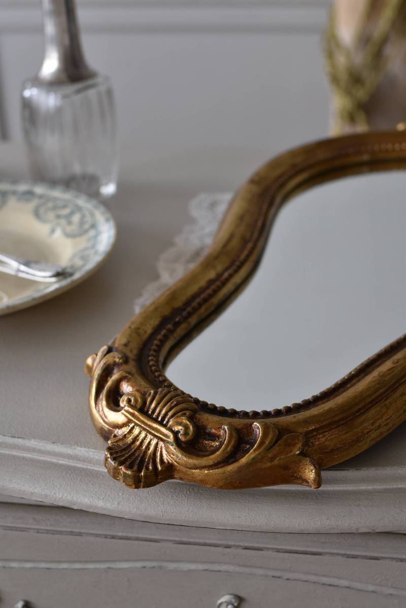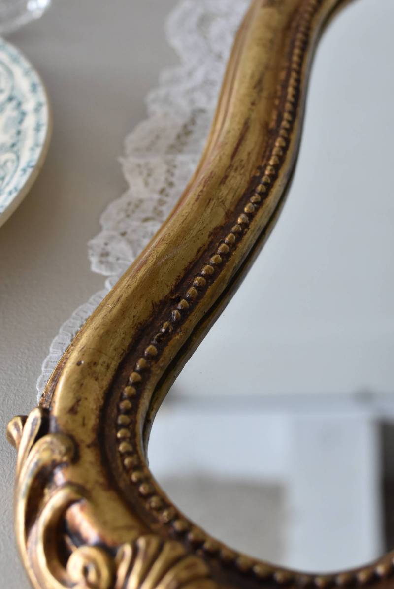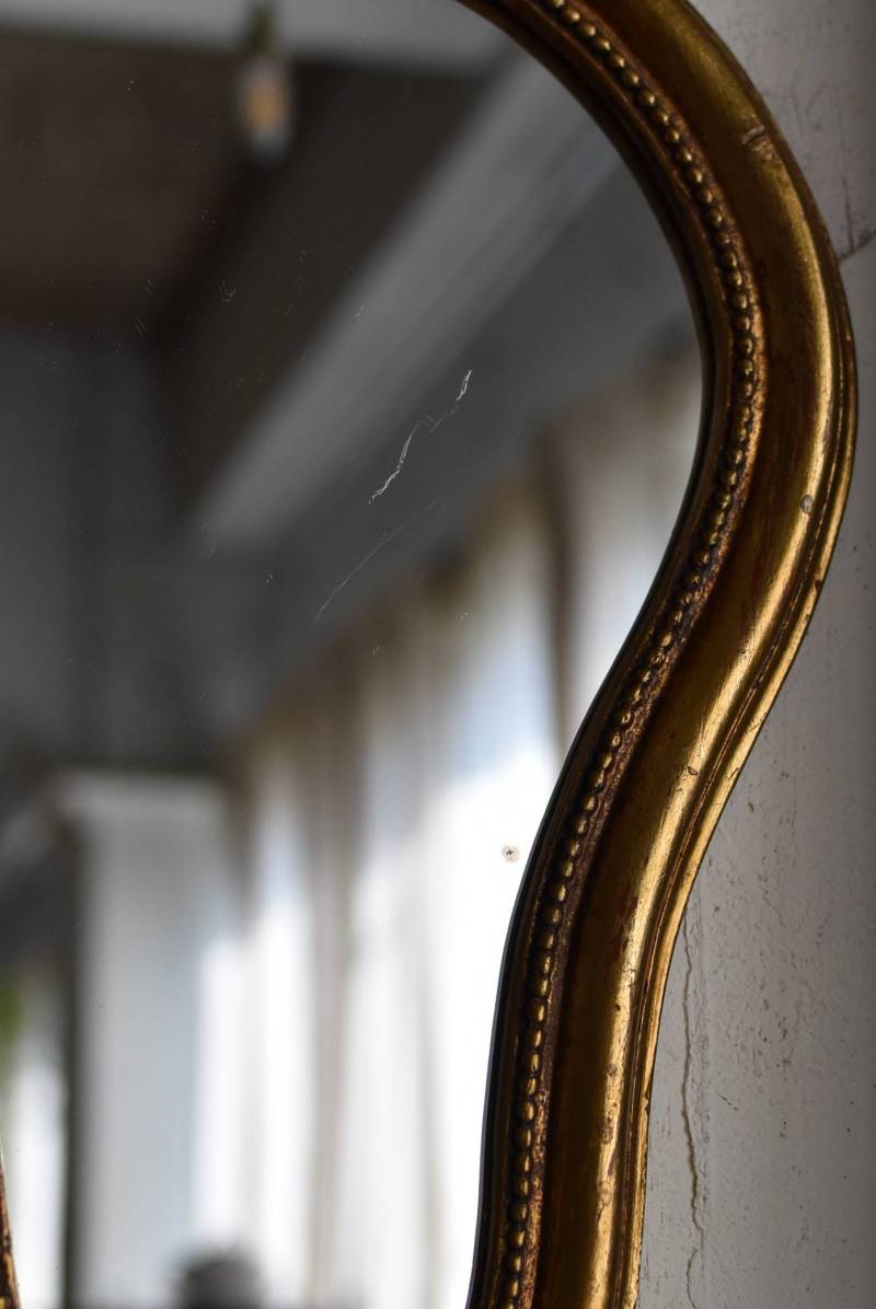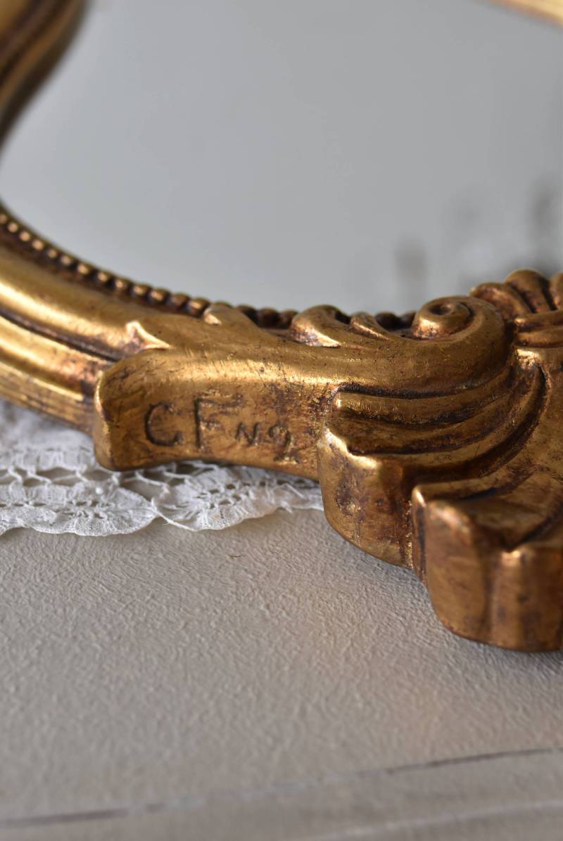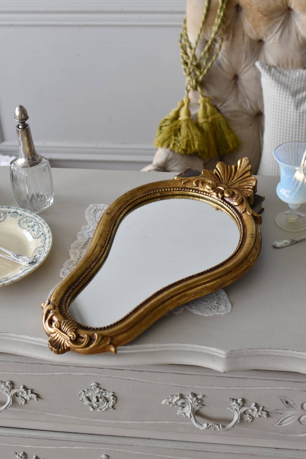 フランスのデコレーションミラー。 植物などの自然モチーフとなった立体感のある造形はしなやかに流れるような優美さが漂い、小さなサイズながらもフランスらしい雰囲気を演出してくれます。上部に向かって広がった曲線シルエットがしっかりと幅があるので壁面をキリッと引き締めてくれ、細やかなパールデザインで囲まれた丁寧な細工が印象的です。 鏡面は古いものですので傷などが見受けられますが歪みはなく、実用として使用できる範囲内かと思います。深みのあるゴールドカラーが上品に見せてくれ、カッコよくもエレガントにも合わせやすそうです。 W 約29cm D 約5cm H 約51.5cm 鏡面積 W約21.5cm×H約34.5cm 重量 約1.5kg