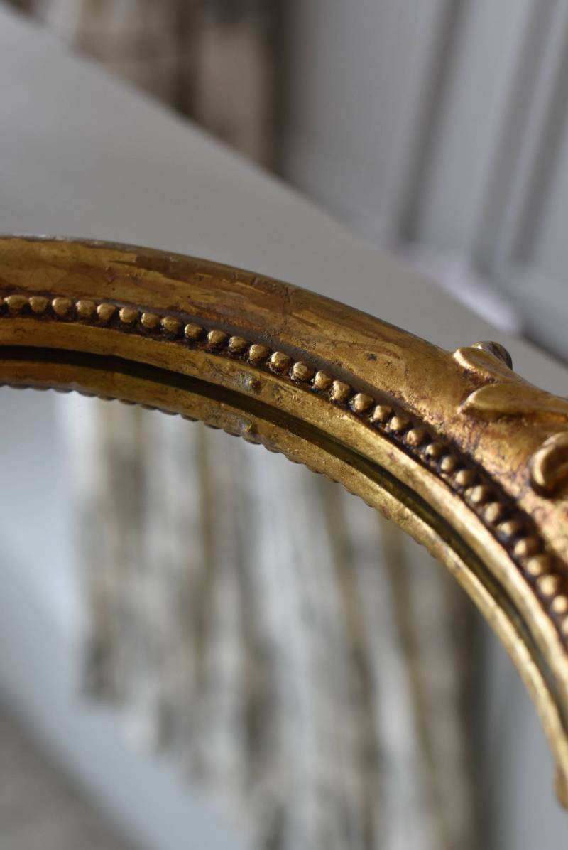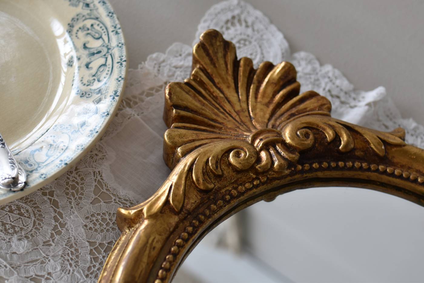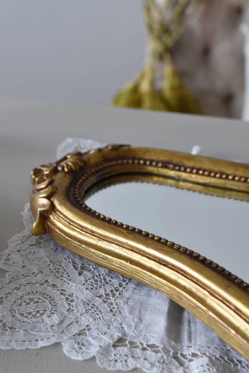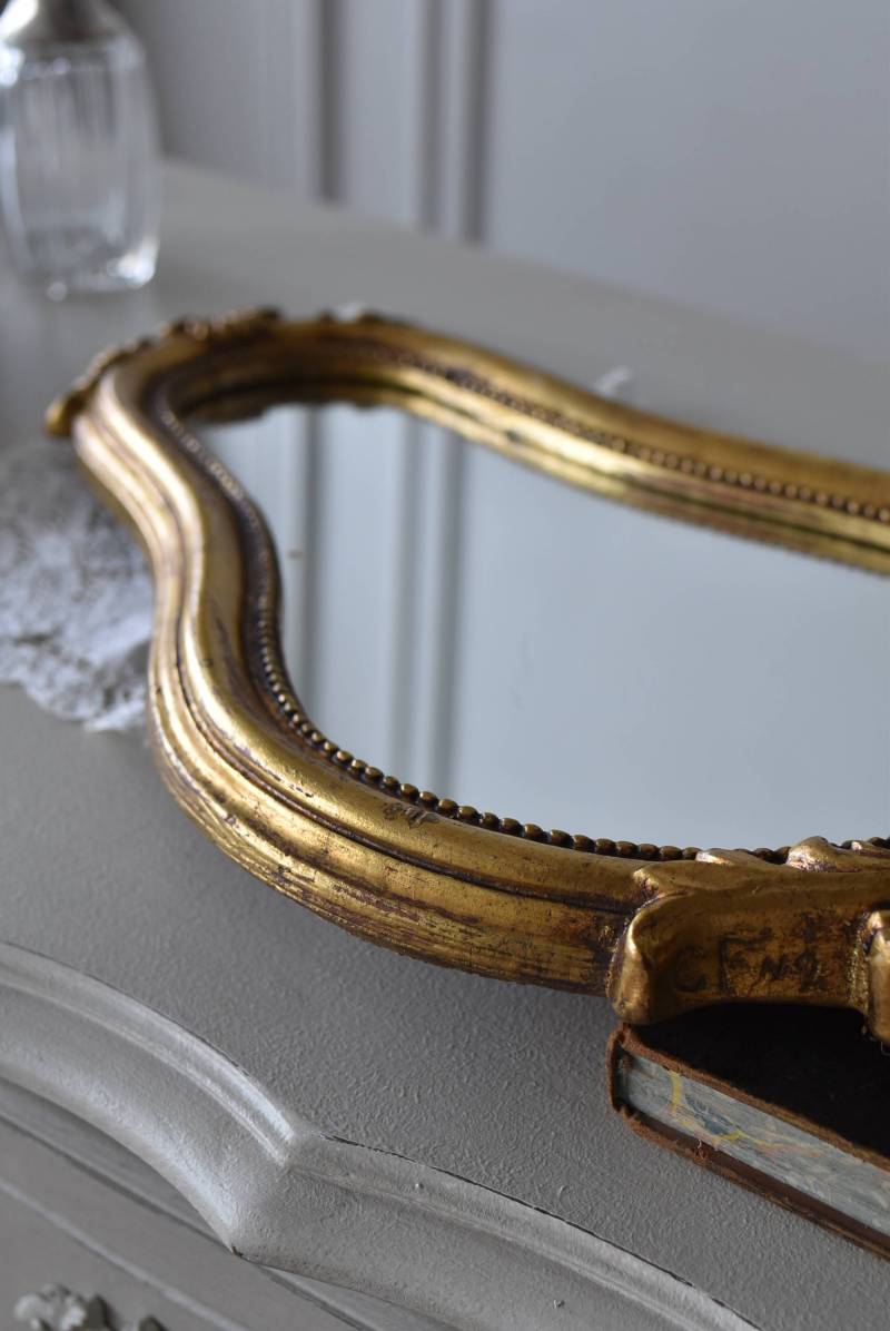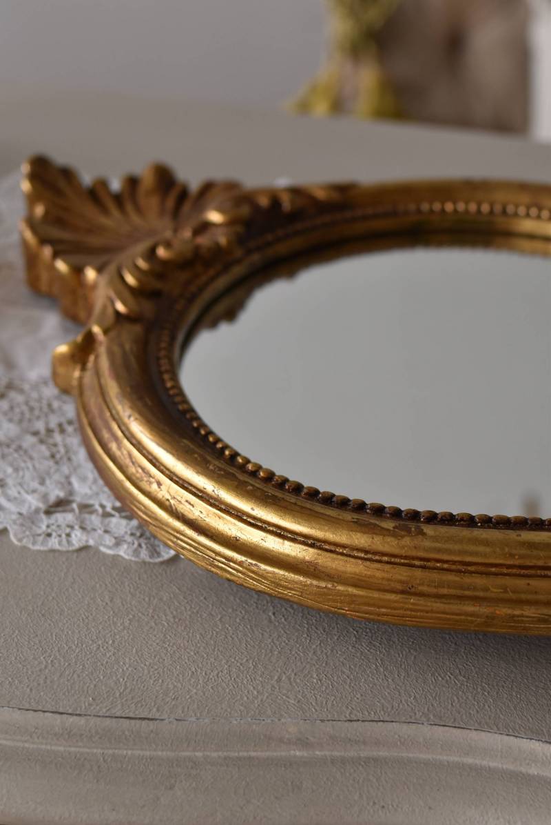 フランスのデコレーションミラー。 植物などの自然モチーフとなった立体感のある造形はしなやかに流れるような優美さが漂い、小さなサイズながらもフランスらしい雰囲気を演出してくれます。上部に向かって広がった曲線シルエットがしっかりと幅があるので壁面をキリッと引き締めてくれ、細やかなパールデザインで囲まれた丁寧な細工が印象的です。 鏡面は古いものですので傷などが見受けられますが歪みはなく、実用として使用できる範囲内かと思います。深みのあるゴールドカラーが上品に見せてくれ、カッコよくもエレガントにも合わせやすそうです。 W 約29cm D 約5cm H 約51.5cm 鏡面積 W約21.5cm×H約34.5cm 重量 約1.5kg