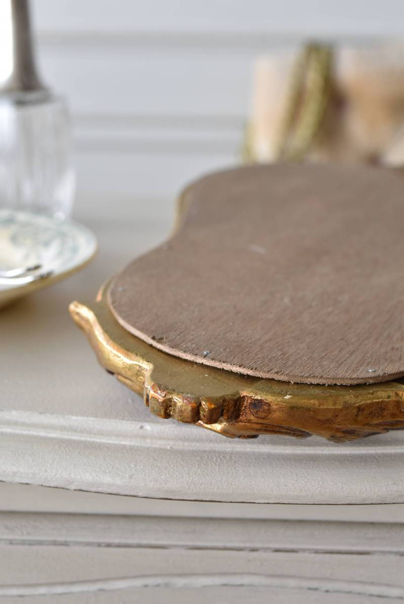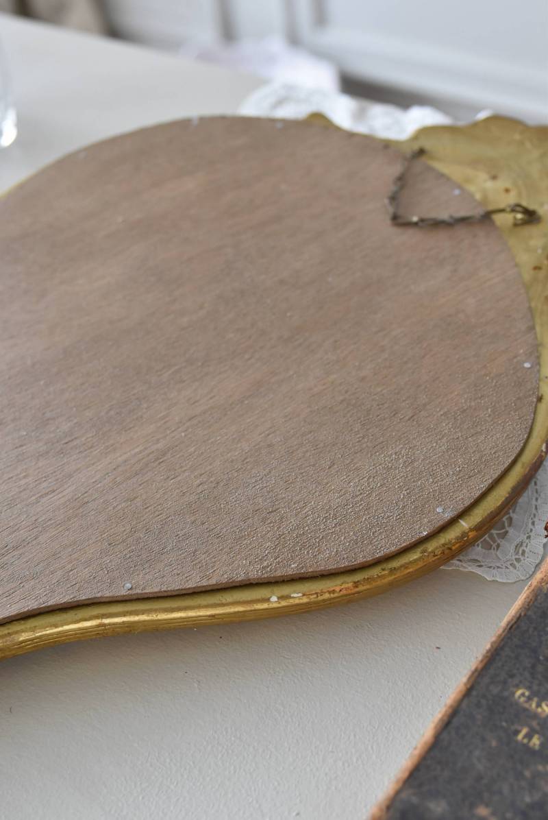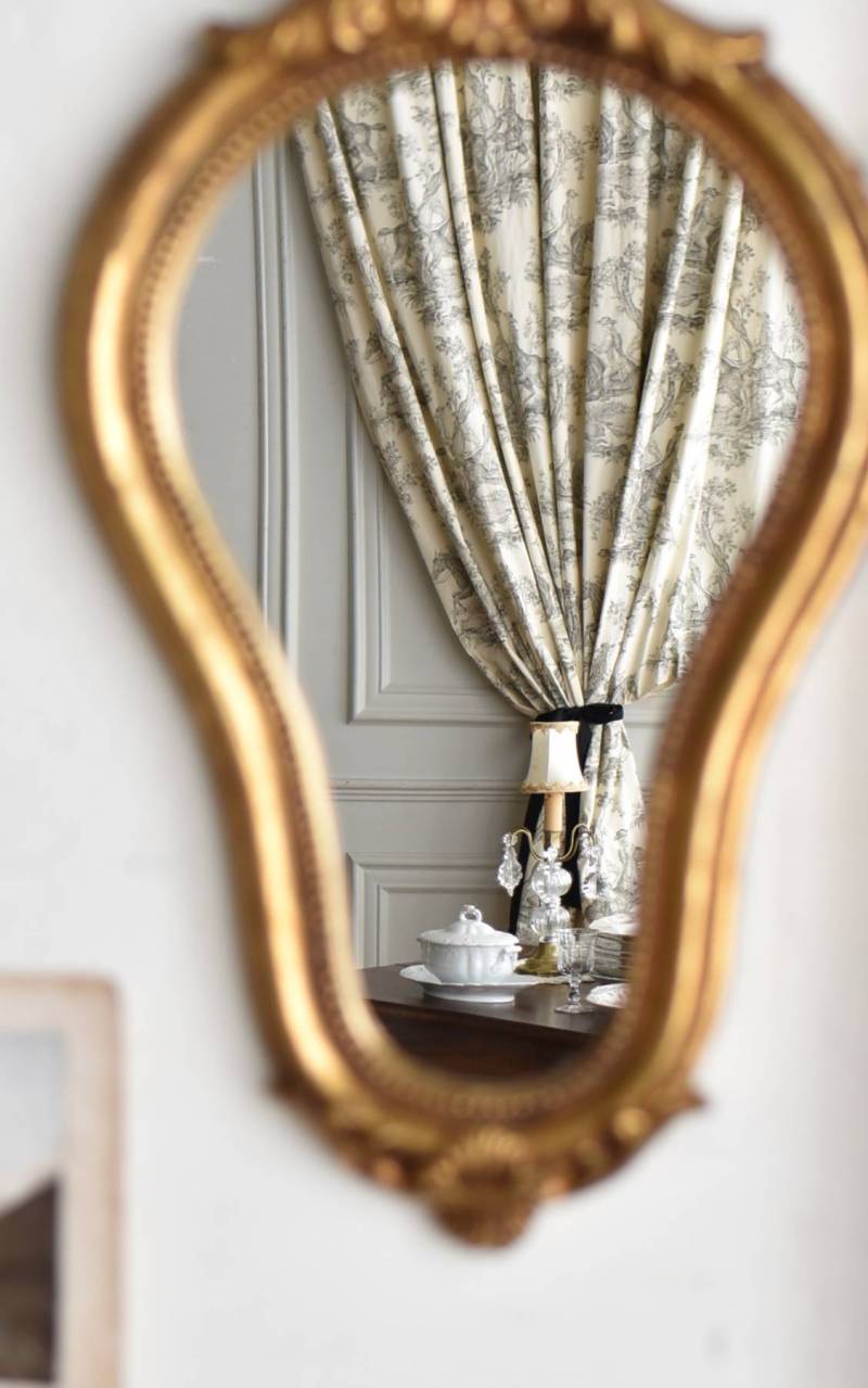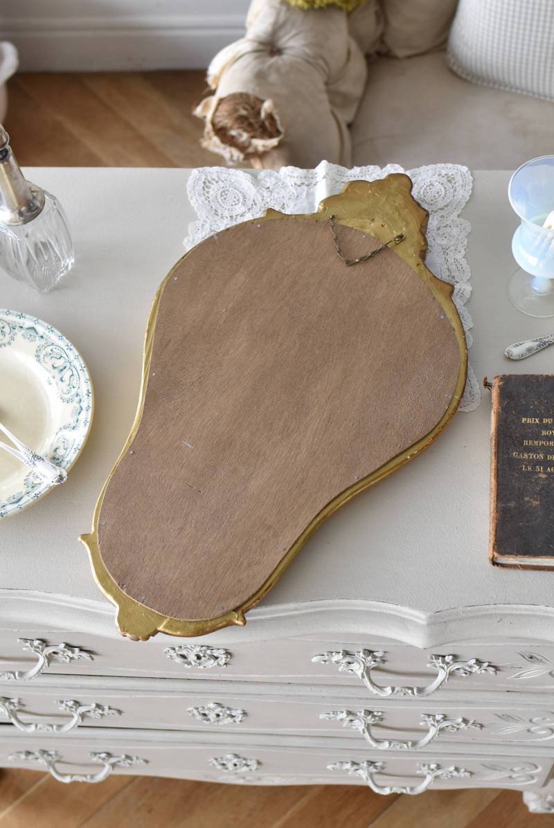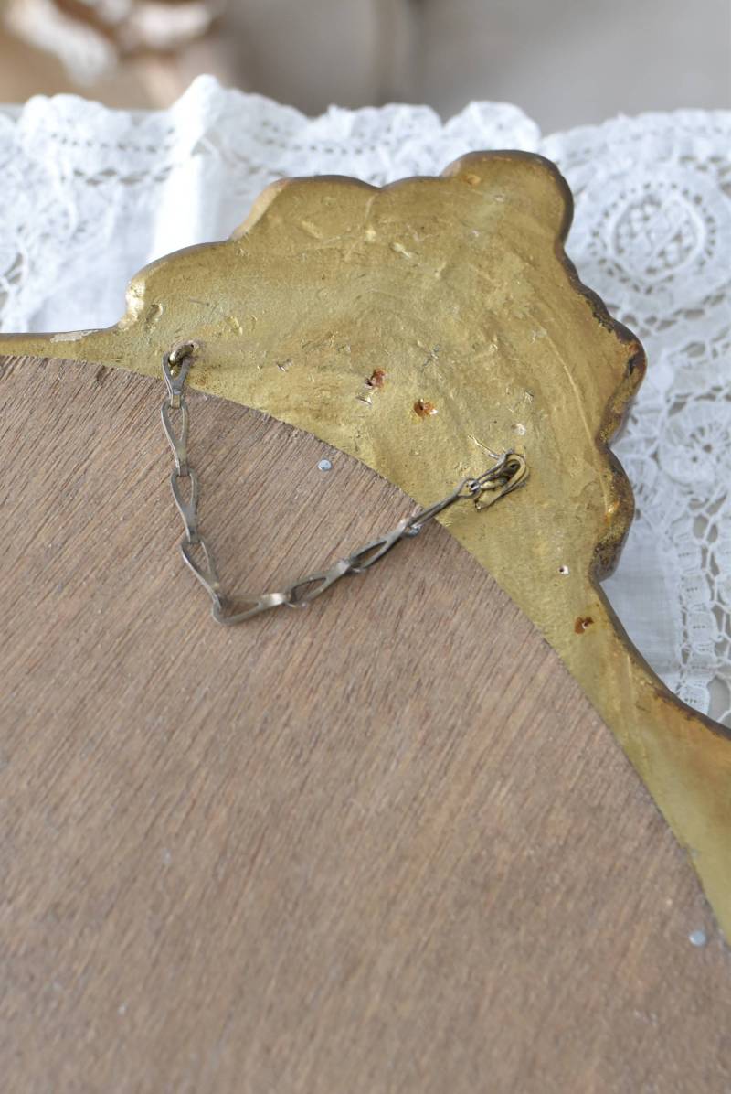 フランスのデコレーションミラー。 植物などの自然モチーフとなった立体感のある造形はしなやかに流れるような優美さが漂い、小さなサイズながらもフランスらしい雰囲気を演出してくれます。上部に向かって広がった曲線シルエットがしっかりと幅があるので壁面をキリッと引き締めてくれ、細やかなパールデザインで囲まれた丁寧な細工が印象的です。 鏡面は古いものですので傷などが見受けられますが歪みはなく、実用として使用できる範囲内かと思います。深みのあるゴールドカラーが上品に見せてくれ、カッコよくもエレガントにも合わせやすそうです。 W 約29cm D 約5cm H 約51.5cm 鏡面積 W約21.5cm×H約34.5cm 重量 約1.5kg