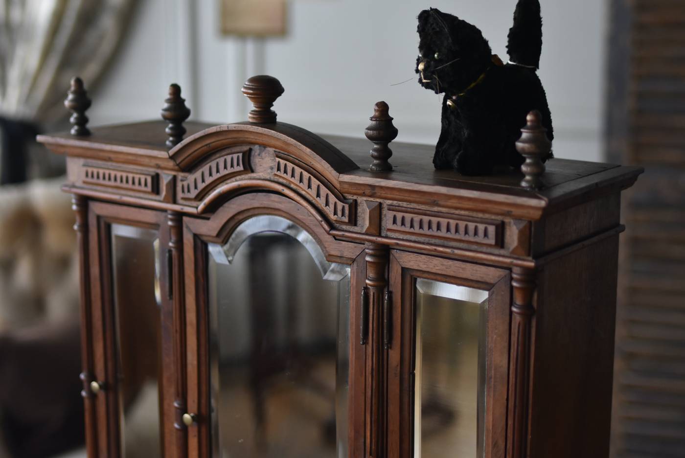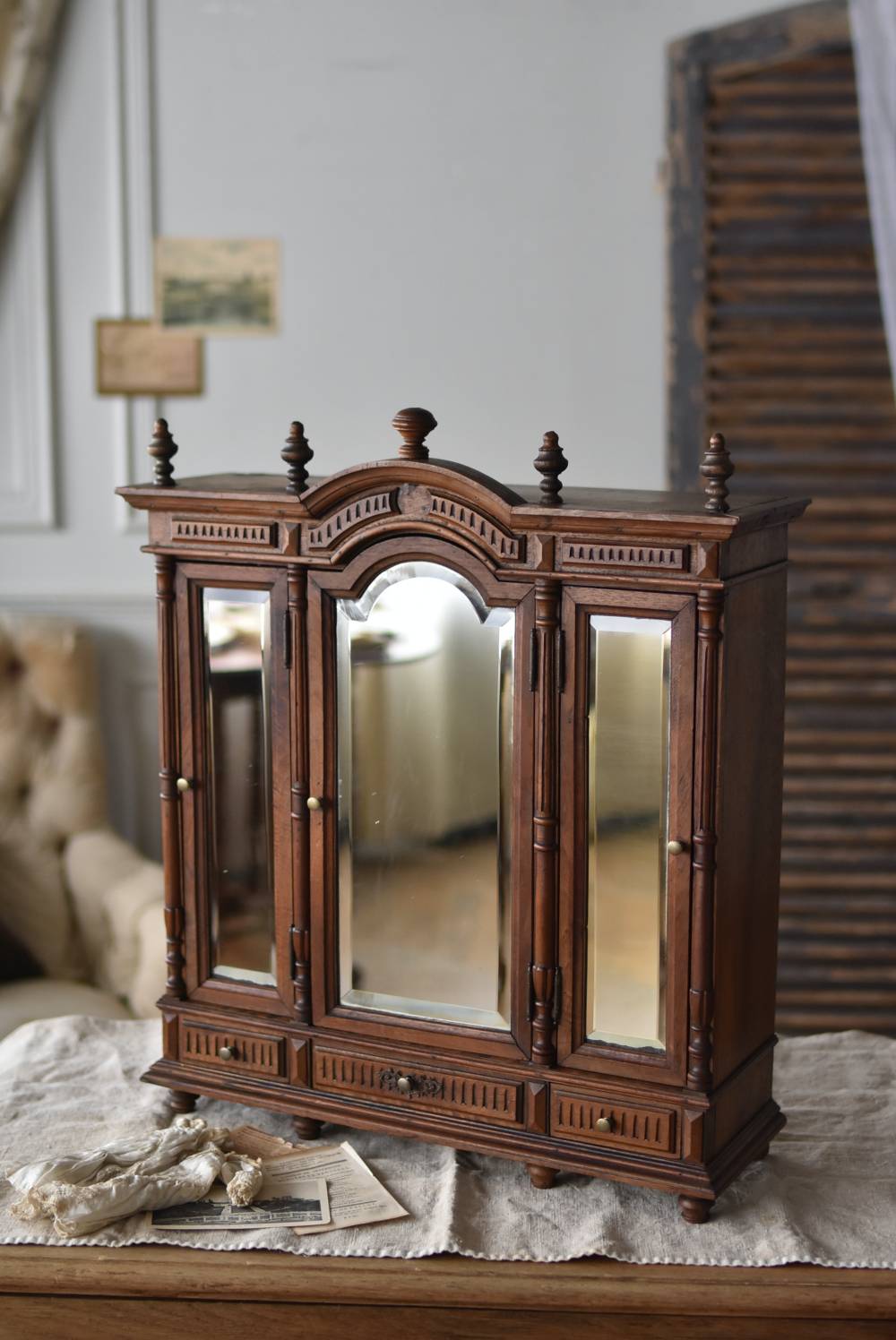 こっくりとした深みのあるブラウンカラーが落ち着きある姿で、美しい陰影を生み出すモールディング装飾が目を惹くシックな佇まい。中央上部がアーチを描く特徴的なボディシルエットで、縁にカットが施されたミラーがはめ込まれた3枚の扉が格式高いデザインとなっています。扉内には3段の棚板、下部には小さめの引き出しが3杯設けられており、細かなものもしっかりと収納できる構造に。