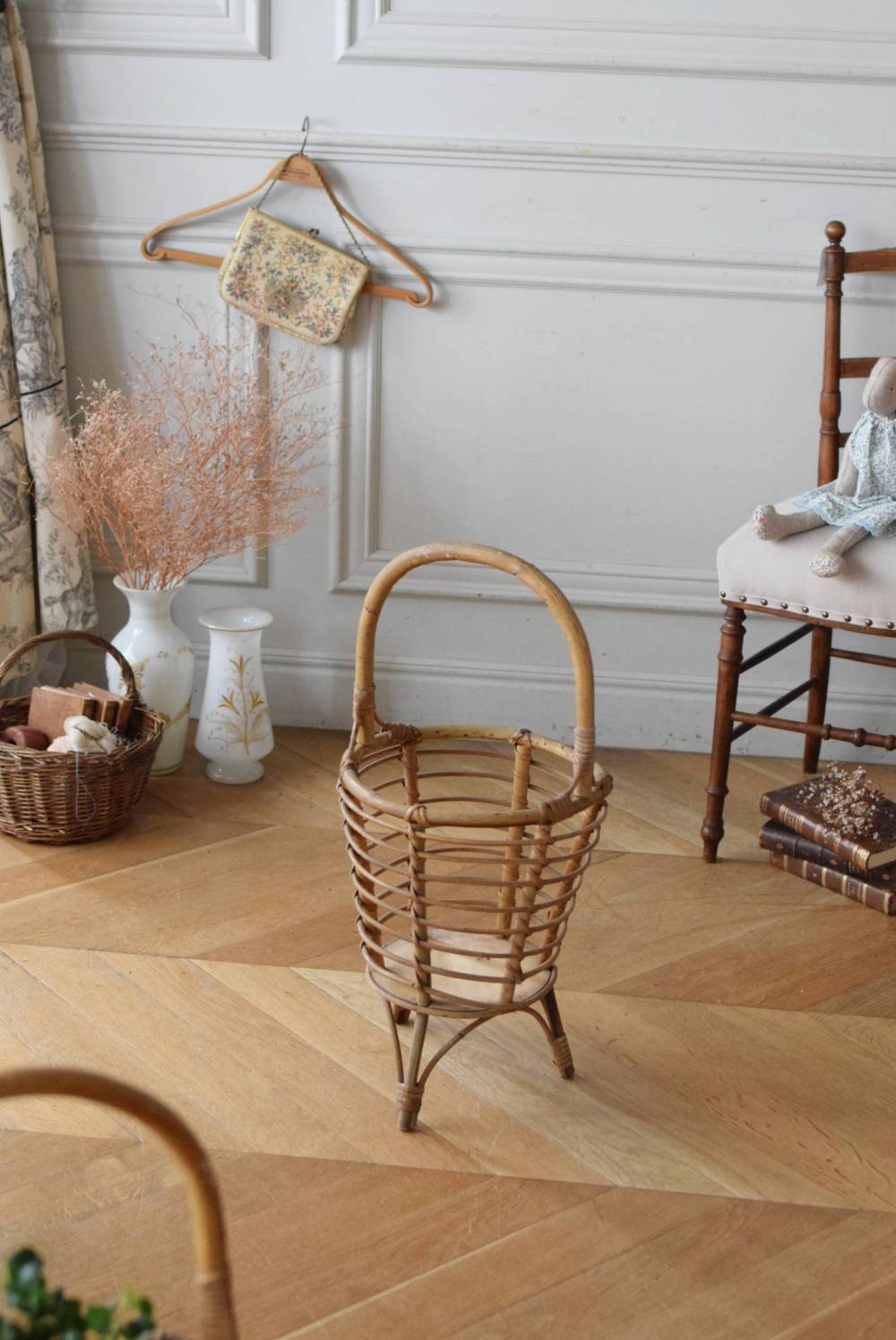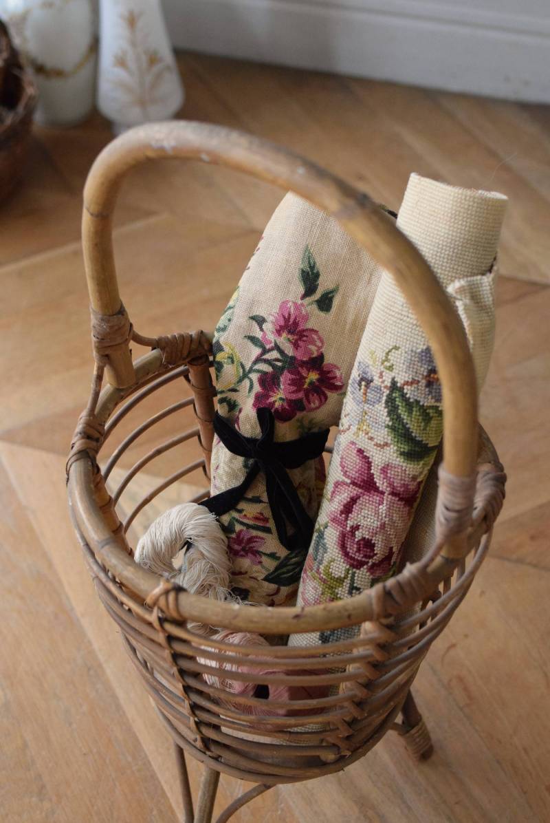 フランスのソーイングスタンド。 内側にお気に入りの柄の布を張り、毛糸などを収める為に使用されていたもの。バンブー素材で作られたナチュラルな姿で、やや歪なフォルムも可愛らしく、空間にほっこりとした温かみを届けてくれます。経年によるくすみも多く見られますが、古いものならではの風合いとしてお楽しみください。 底面はフラットで、底板の内寸が直径17cmほどありますので、鉢植えなどを飾ったり、スリッパなどを収納したりと様々な用途にアレンジできます。 W 約29cm D 約28cm H 約64cm 内寸直径 約24〜25cm 深さ 約24cm