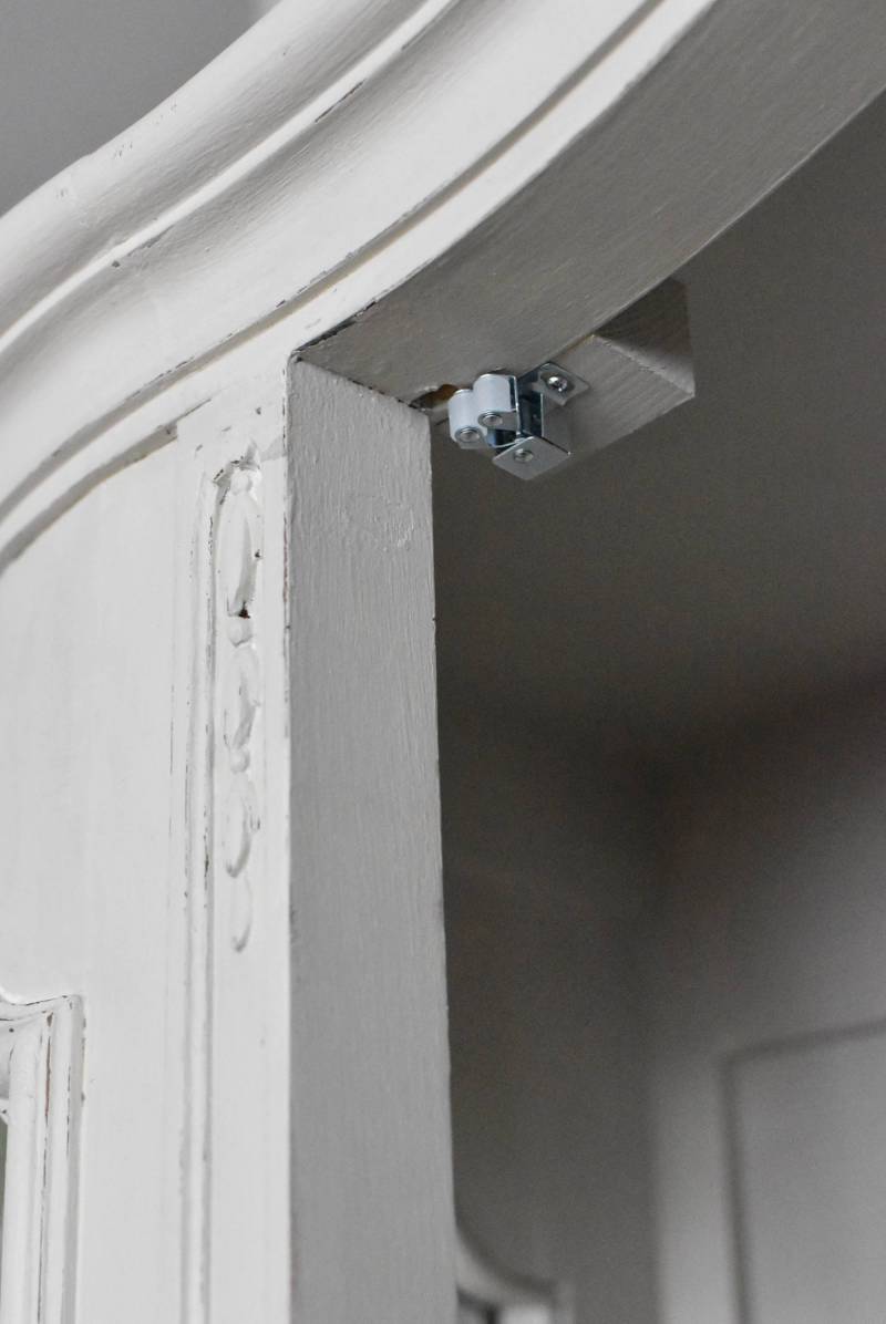 3枚の澄んだガラス棚板が隅々まで明るく見せてくれます。棚受けの穴の位置を変えると、多少の高さ調節が可能です。背面内側と下部の木製棚板には滑らかな手触りのファブリックが貼られています。扉はローラーキャッチによってスムーズに開閉できます。施錠はできませんが鍵は取っ手代わりとしてご使用ください。