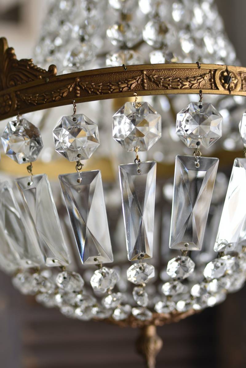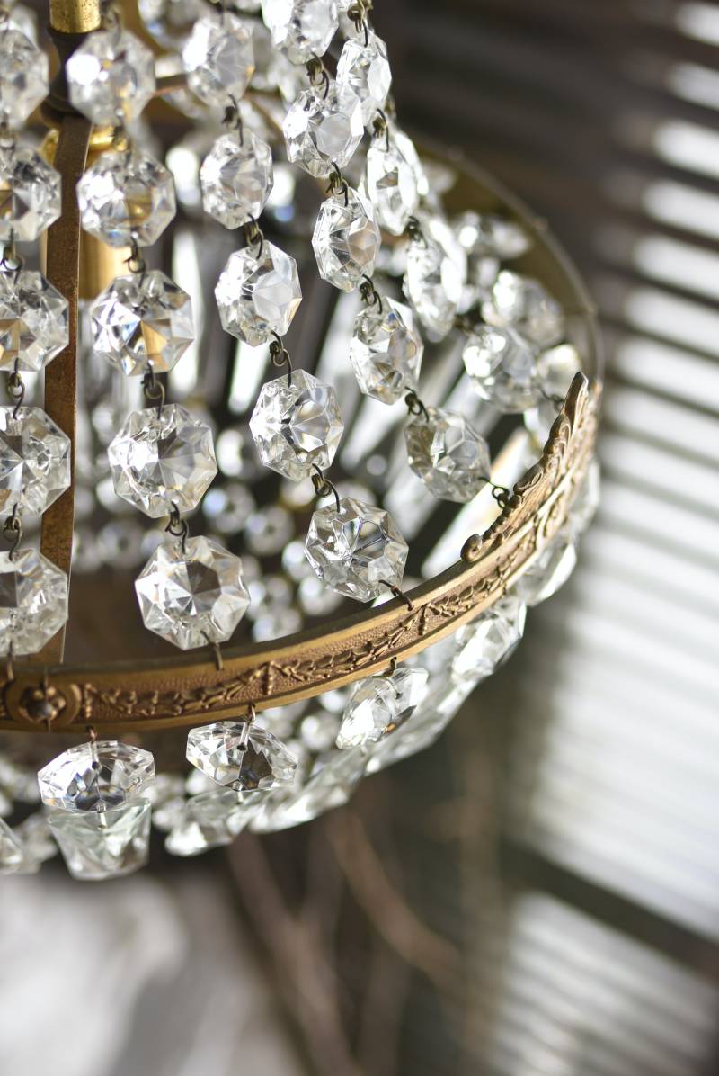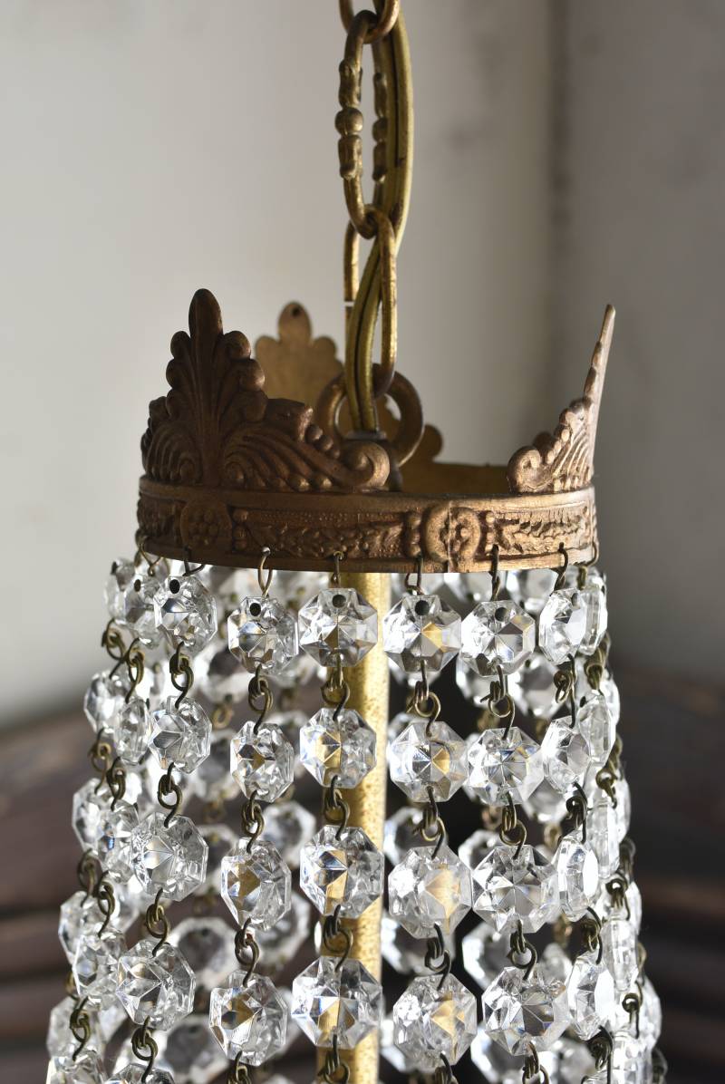 縦長で下部に丸みがあり、しなやかに流れるような美しいシルエットが特徴的。ややくすんだゴールドカラーのフレームには小花や植物のガーランド、透かし模様などが丁寧にあしらわれており、空間の雰囲気を高めてくれるエレガントなデザインです。大小様々なガラスパーツがずらりと連なる豪華な姿で、細やかなカットが光を反射して煌めき、明かりを灯した際にも幻想的な陰影を楽しめる一品に。
