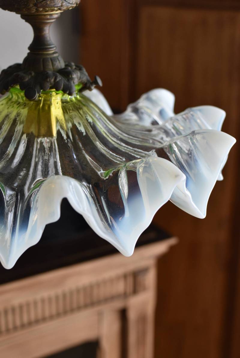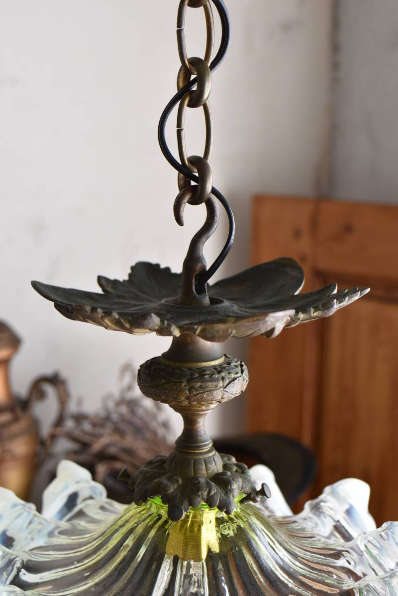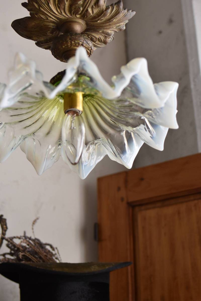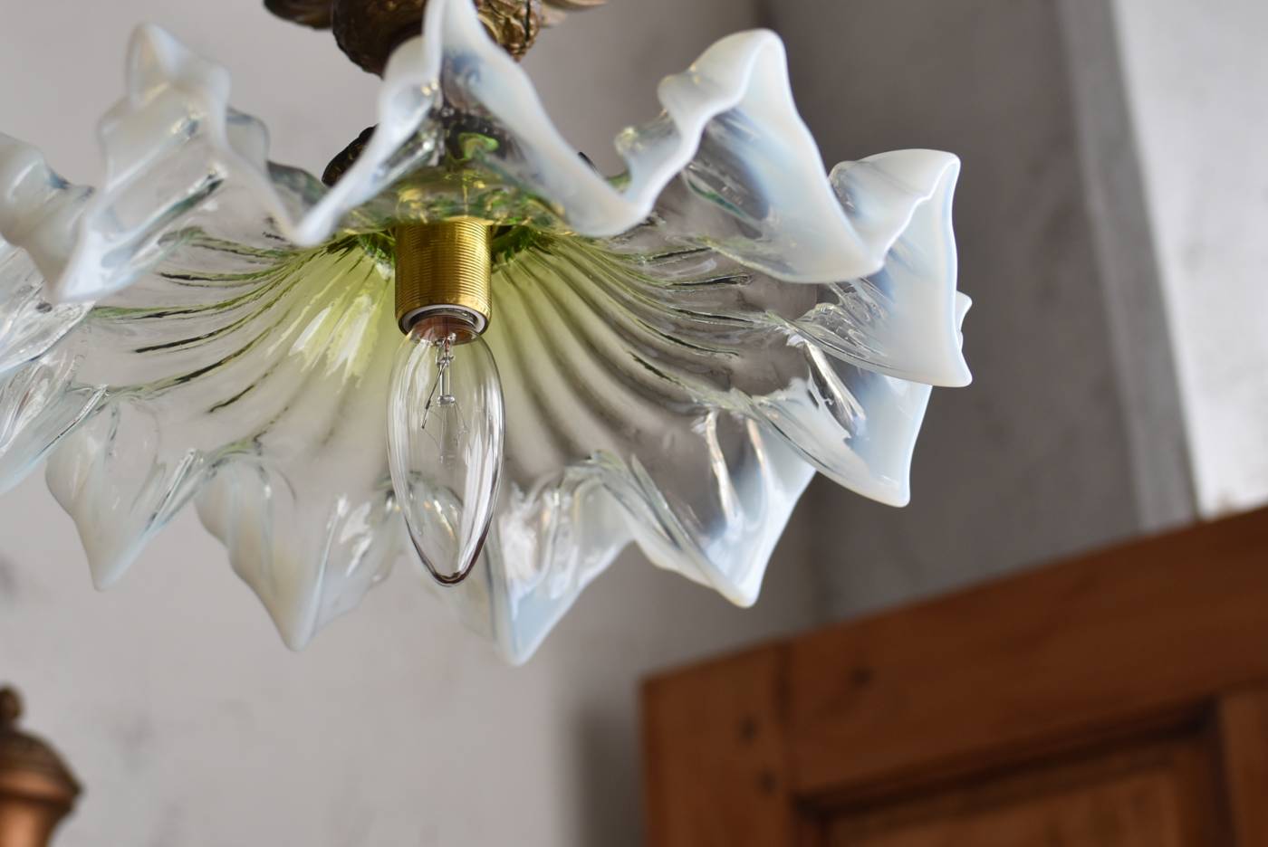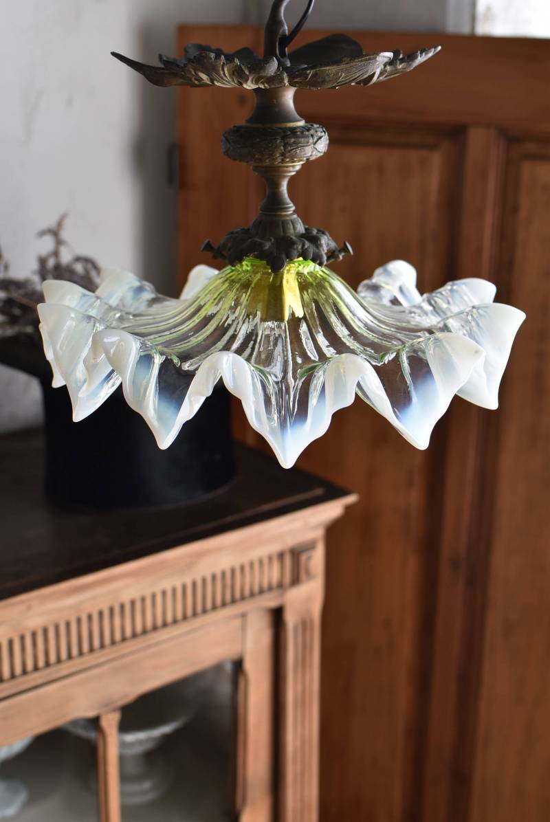 フランスの1 灯ペンダントランプ。 大胆なフリルが特徴で、クリアグリーンから乳白色へのグラデーションが爽やかさと共にクラシカルな印象も感じられる佇まい。長い時を感じさせてくれるホルダー部分は植物をモチーフとした造形で、フランスらしい優雅なイメージをもたらしてくれるデザインです。明かりを灯すとオパリンガラス特有の美しい光彩が楽しめ、幻想的な空間演出に活躍してくれそう。 コード・ソケット・シーリングは新しい物に交換済みです。電球は付属しません。 シェード直径 約29.5cm H 約26cm(電球含まず) コード含む全長 約40cm 電球口径 E17 重量 約1.8kg *60W以下をご使用下さい。