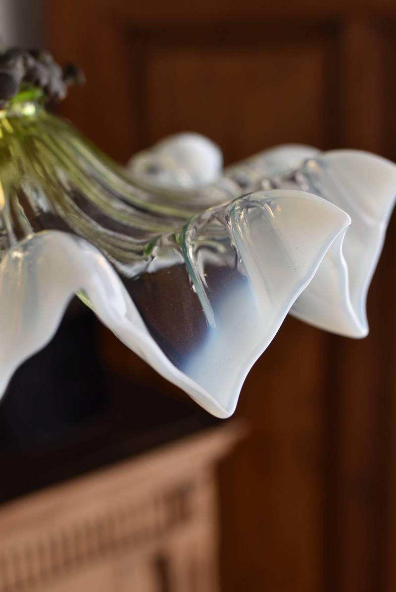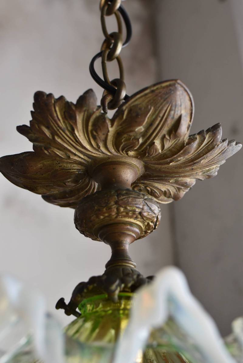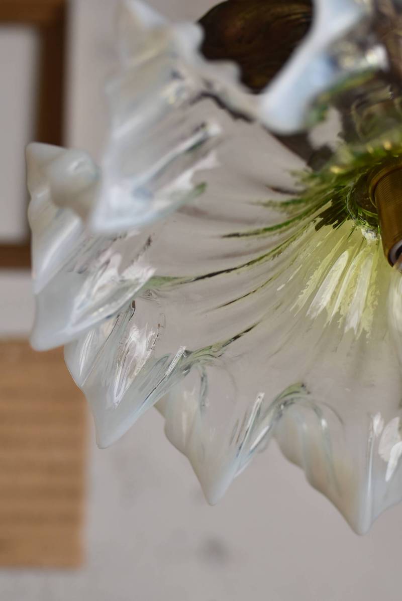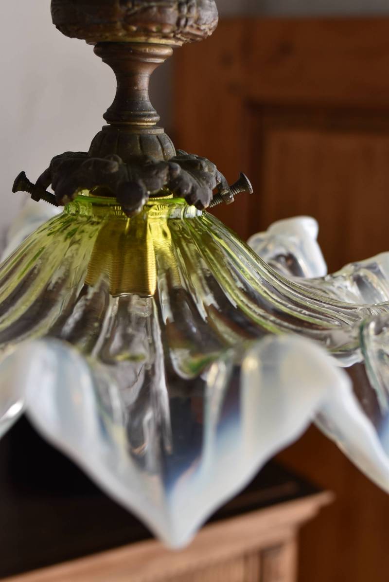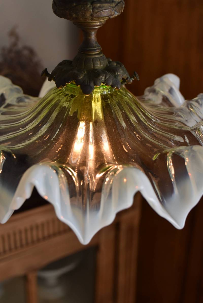 フランスの1 灯ペンダントランプ。 大胆なフリルが特徴で、クリアグリーンから乳白色へのグラデーションが爽やかさと共にクラシカルな印象も感じられる佇まい。長い時を感じさせてくれるホルダー部分は植物をモチーフとした造形で、フランスらしい優雅なイメージをもたらしてくれるデザインです。明かりを灯すとオパリンガラス特有の美しい光彩が楽しめ、幻想的な空間演出に活躍してくれそう。 コード・ソケット・シーリングは新しい物に交換済みです。電球は付属しません。 シェード直径 約29.5cm H 約26cm(電球含まず) コード含む全長 約40cm 電球口径 E17 重量 約1.8kg *60W以下をご使用下さい。