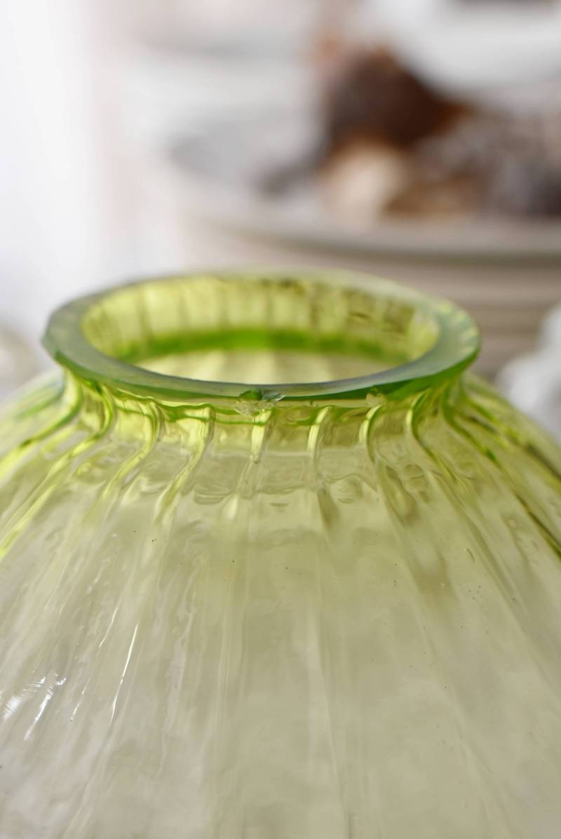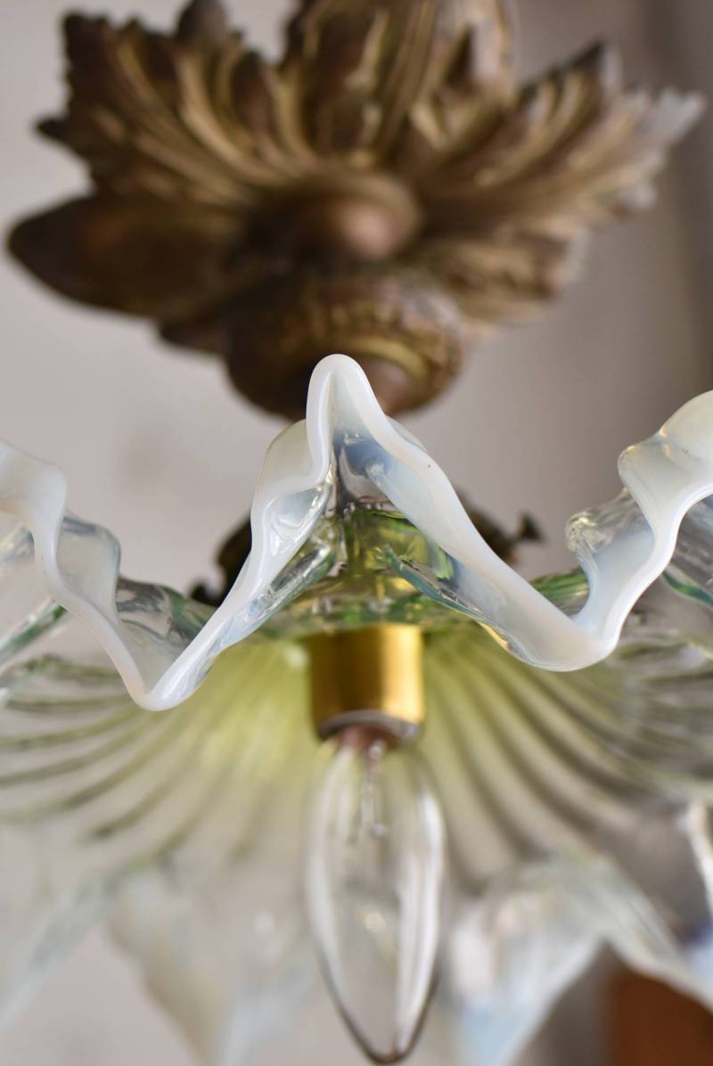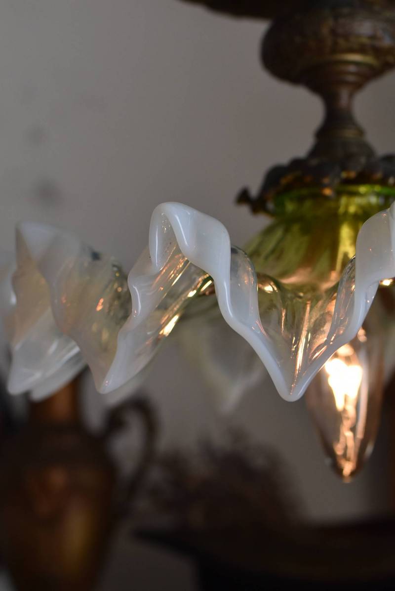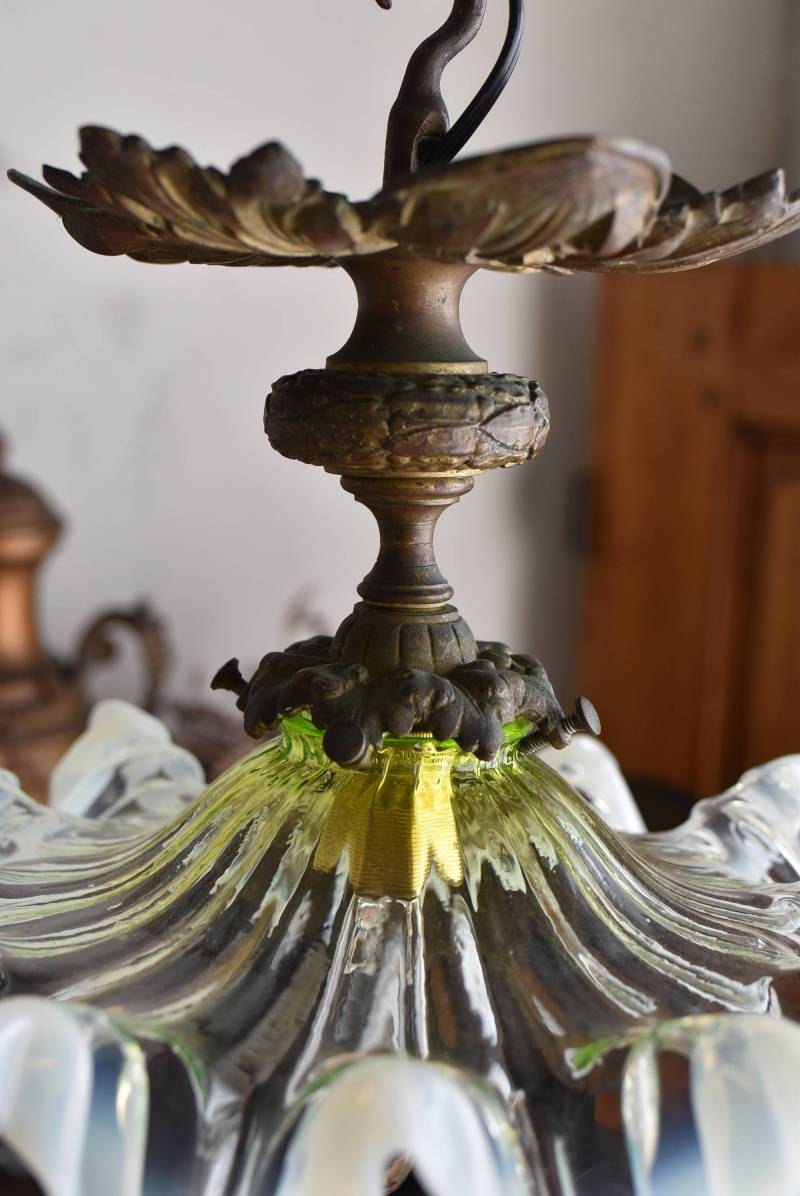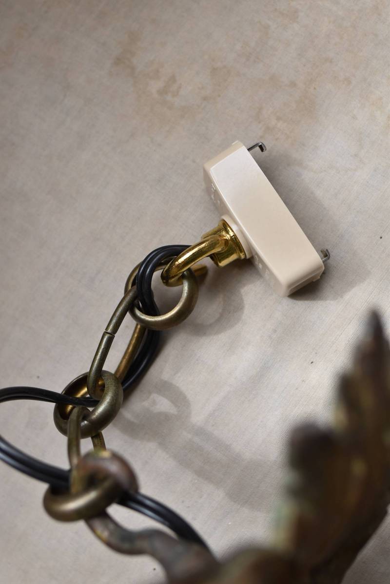 フランスの1 灯ペンダントランプ。 大胆なフリルが特徴で、クリアグリーンから乳白色へのグラデーションが爽やかさと共にクラシカルな印象も感じられる佇まい。長い時を感じさせてくれるホルダー部分は植物をモチーフとした造形で、フランスらしい優雅なイメージをもたらしてくれるデザインです。明かりを灯すとオパリンガラス特有の美しい光彩が楽しめ、幻想的な空間演出に活躍してくれそう。 コード・ソケット・シーリングは新しい物に交換済みです。電球は付属しません。 シェード直径 約29.5cm H 約26cm(電球含まず) コード含む全長 約40cm 電球口径 E17 重量 約1.8kg *60W以下をご使用下さい。